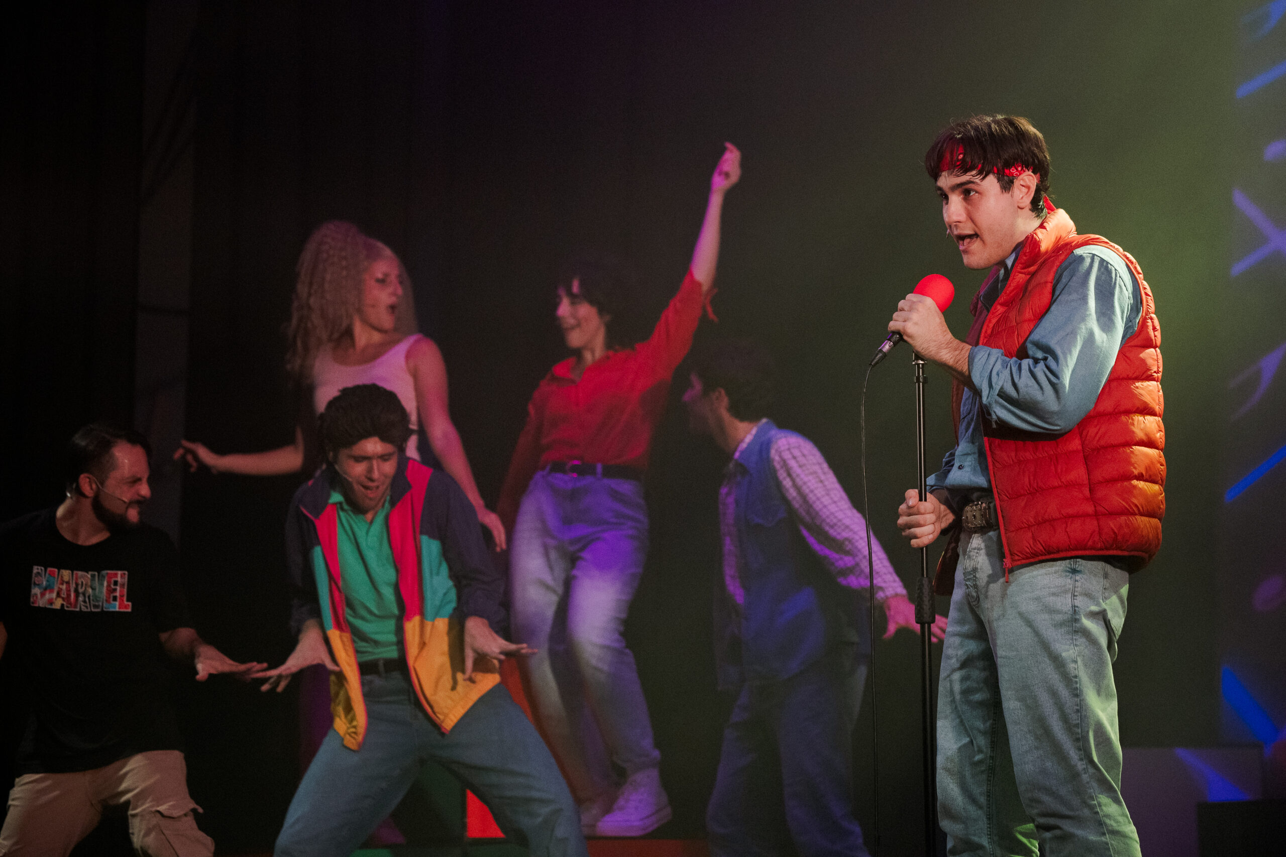 Auf der Bühne, zusammen mit dem Protagonisten Manuel Mercuri, Performer, Akrobatentänzer und internationaler Content Creator mit mehr als 38 Millionen Followern auf TikTok, Instagram und YouTube, einer Kompanie von wilden Performern, in der Doppelrolle von Professoren heute, und Studenten in den 80er Jahren, die ausschließlich live singen, sowie natürlich Schauspieler und Tänzer.